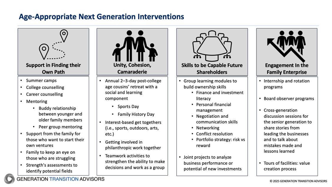 Families often ask, “When is the right time to start developing the next generation?” The answer: is now! —but development efforts must be tailored to age and interests. Understanding what matters to different age cohorts within the next generation allows you to design initiatives that resonate and engage.