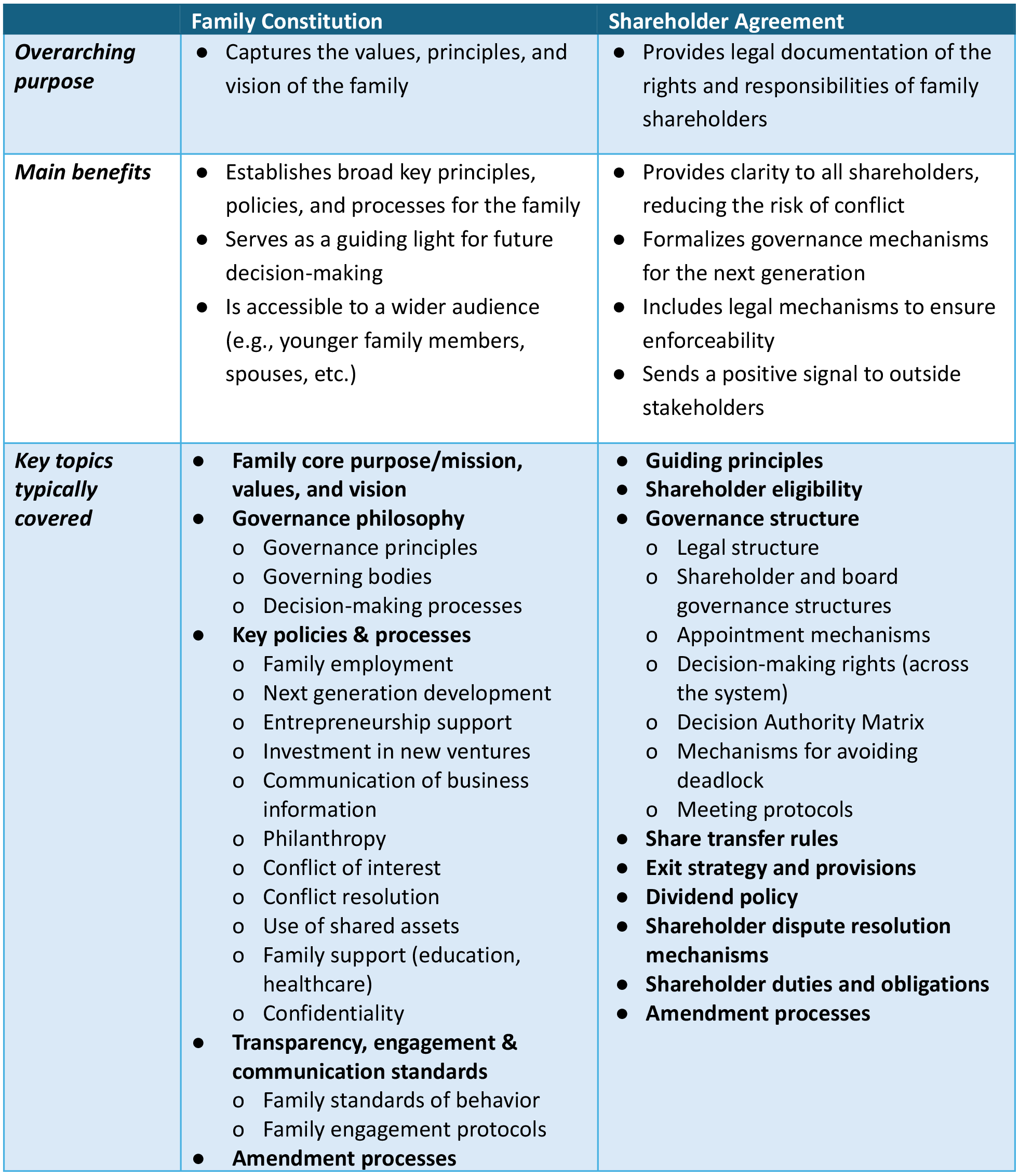Both Family Constitutions and Shareholder Agreements play foundational, but distinct, roles in a family governance system.